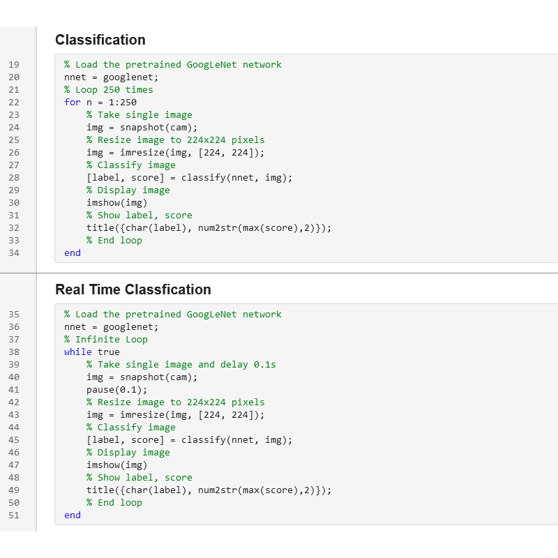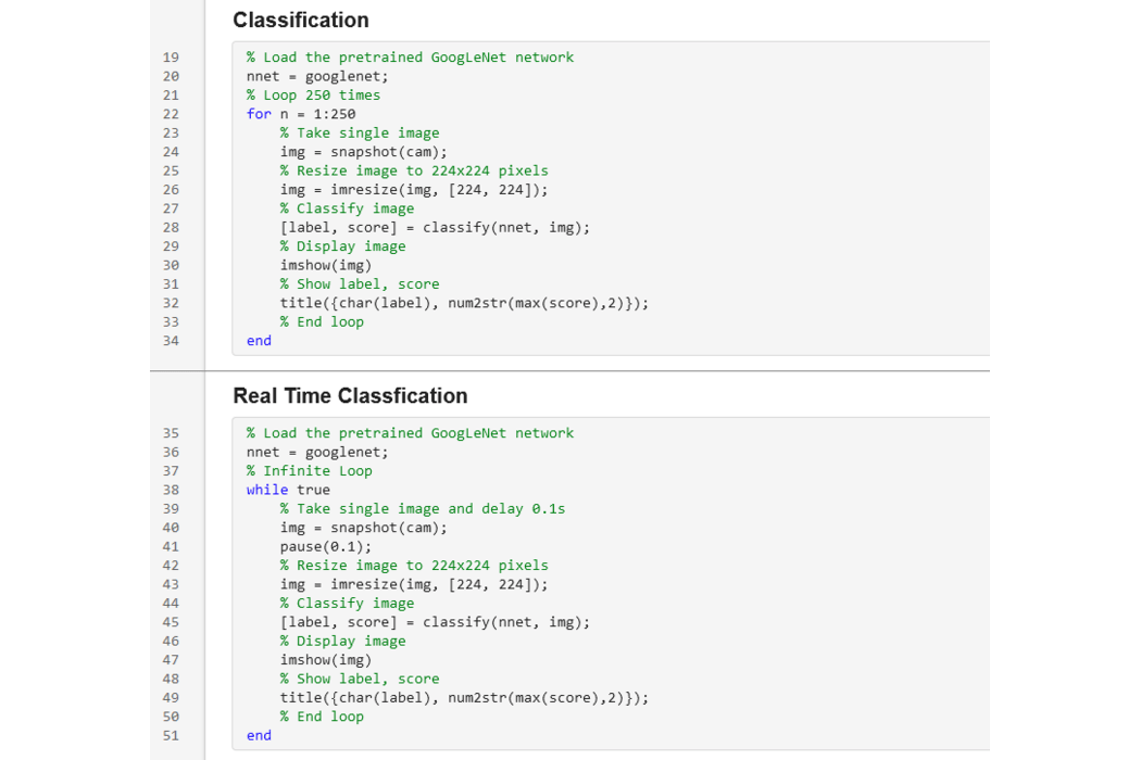 Using USB Webcams in MATLAB Online, classify object using pretrained GoogleNet network (Deep Learning Techniques).